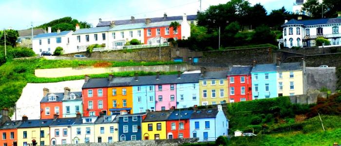 Contrasts and integrating diversities.A smokey bleak sky disappearing behind a pea-green house with a purple front door adjacent to more sombre identical house with a dark blue facade and shamrock green windows...