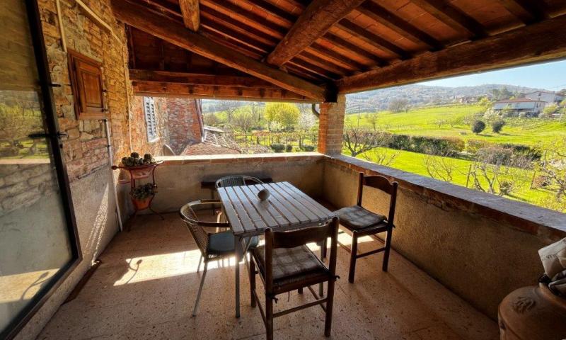 The apartment of about 100 square meters, is on the first floor, going up a comfortable external staircase from which you reach a loggia with wooden beams and terracotta tiles.