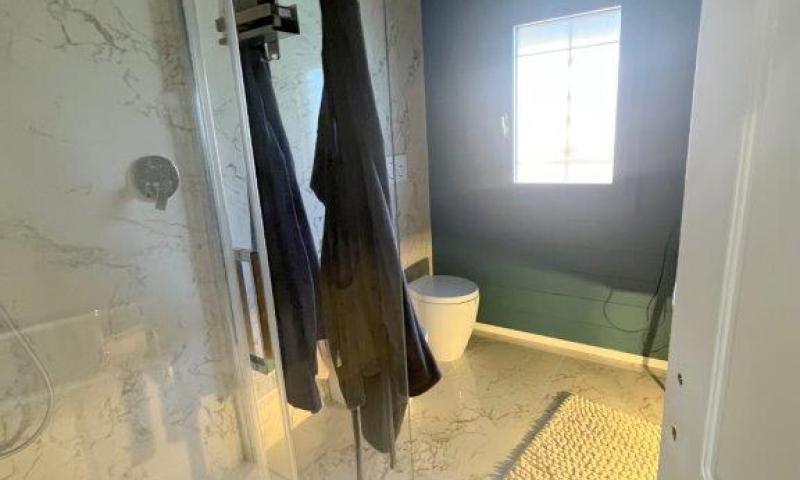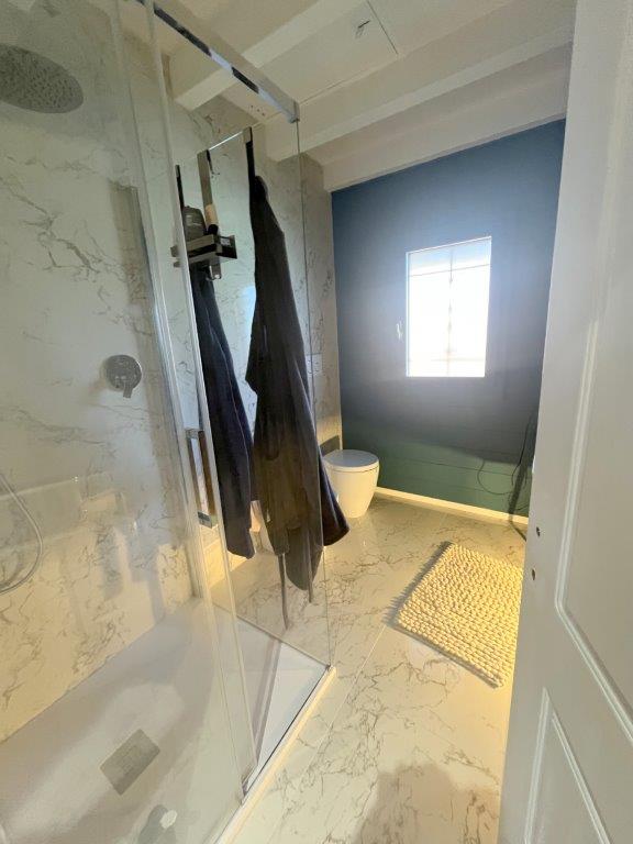 - The 160-square-meter villa is on one level: the main door leads to the entrance, a spacious open-plan living room with high ceilings and parquet flooring. To the right of the entrance is the modern kitchen, with French doors opening onto the garden. Next to the kitchen is a bathroom and utility room. The sleeping area includes a single bedroom, a bathroom with shower, and the master bedroom with ensuite bathroom and large walk-in closet (which can be converted into an additional bedroom).