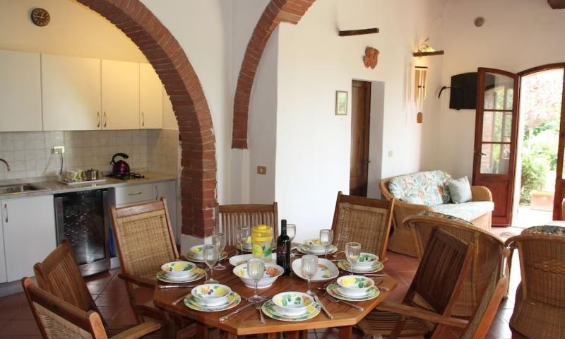 The garden surrounding the property is well-kept and has fruit trees and olive trees. Inside the fenced garden there is a swimming pool, outbuildings (one used as a garage) covering approximately 150 sqm and an original working pizza oven.