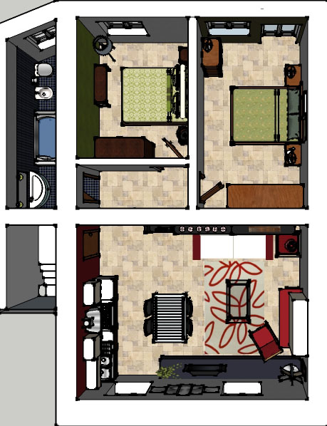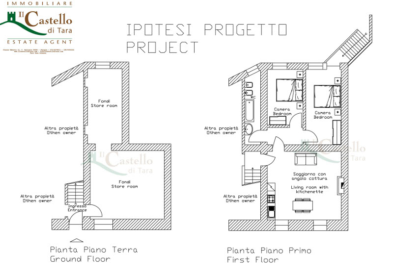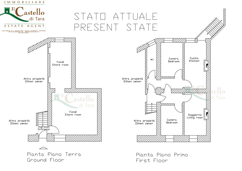 - Ground Floor: two rooms (one with arches and the other with beams)