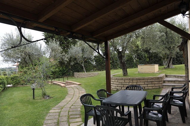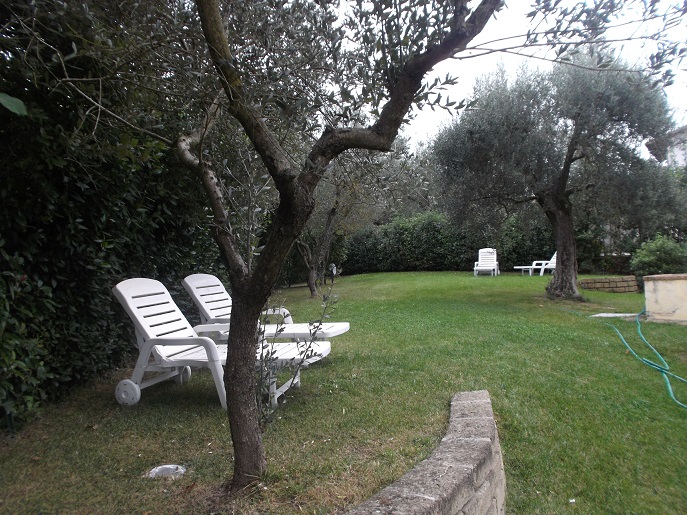 It has a private garden with olive trees and a wooden porch for outdoor dining.