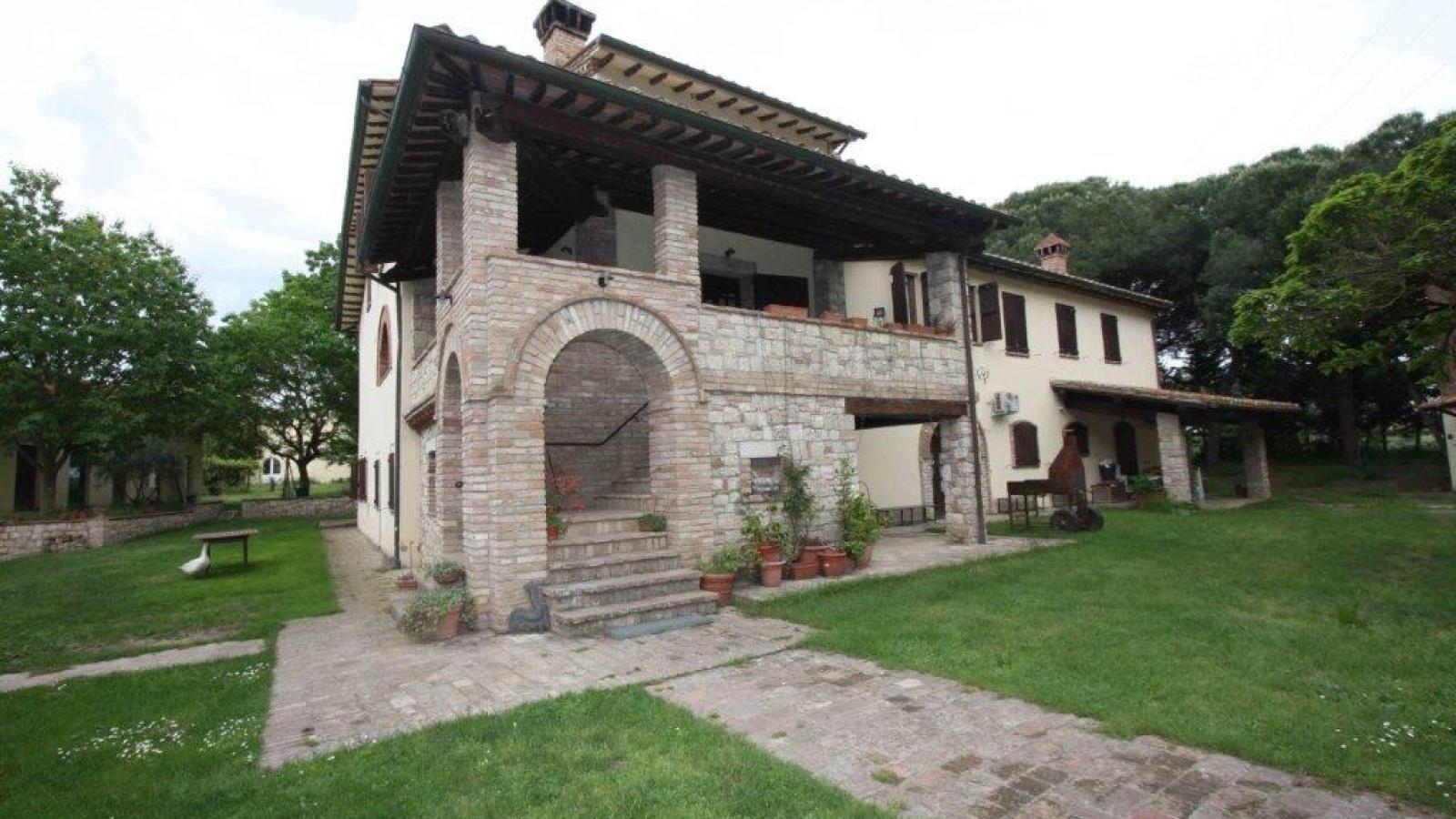 In posizione pianeggiante, a meno di dieci minuti da Castiglione del Lago e le bellezze del Lago Trasimeno, magnifico complesso immobiliare con terreno, giardino e annessi.