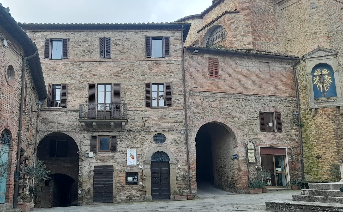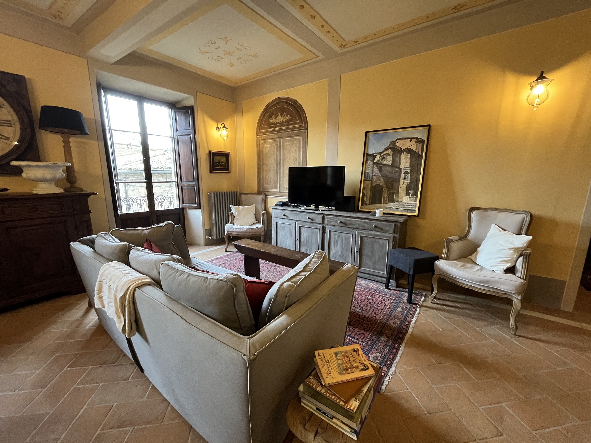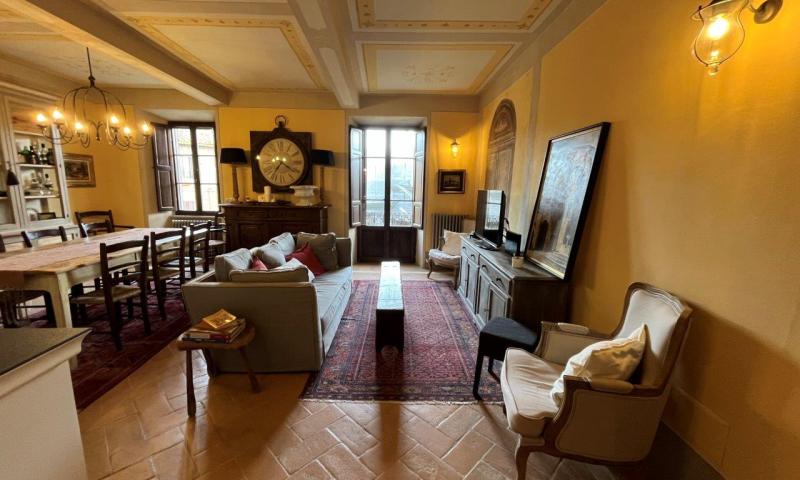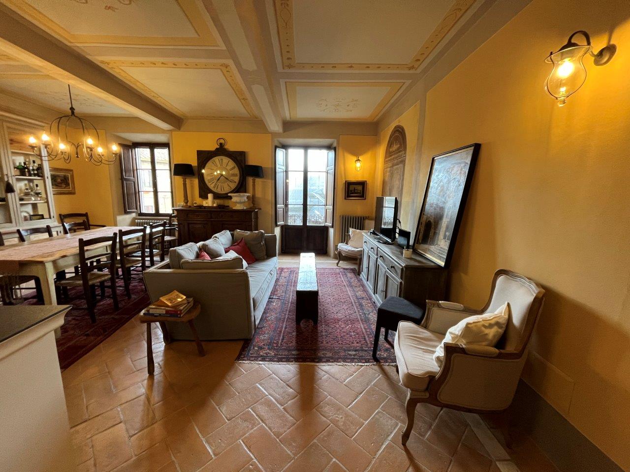 Nel cuore del borgo medievale di Panicale, questo appartamento completamente rinnovato si trova al primo piano di un antico palazzo posto sulle mura del centro storico con doppio affaccio, sia sulla piazza principale sia sulla vallata.